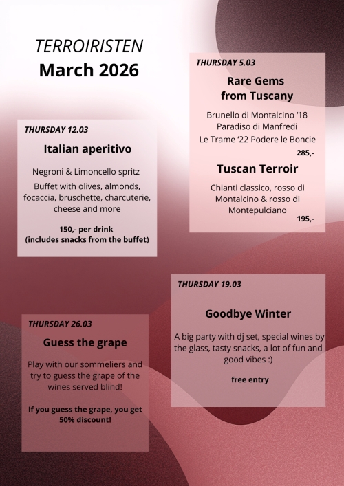 Marts er desuden fyldt med gode events om torsdagen, hvor du f.eks. kan kigge forbi og smage toscanske vine eller gætte en druesort. Vores torsdags-events starter altid fra kl. 17:00 og løber til kl. 22:00 (eller indtil udsolgt). Du behøver ikke at bestilles bord (selvom du naturligvis er velkommen til det), købes billet eller lign. Du kigger bare forbi! Tak, fordi du læste med!