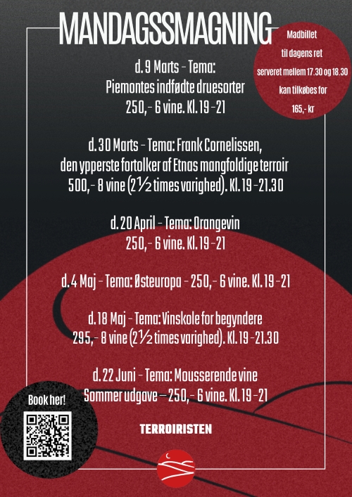 Skål og god fornøjelse. MandagssmagningerVores mandagssmagninger er tilbage med hele 6 planlagte smagninger, hvor du bl.a. kan smage Piemontes indfødte druesorter, Frank Cornelissens ikoniske Etna-vine, orangevine og meget mere. Læs mere herunder, og køb billet allerede nu til din næste mandagssmagning.